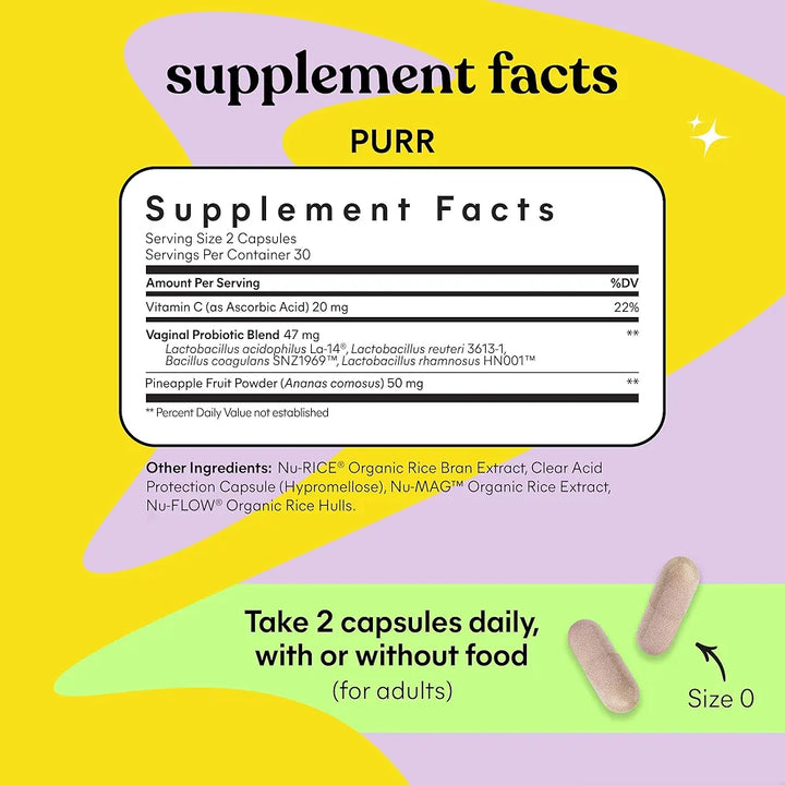 SUPPORTS FEMININE HEALTH: Lemme Purr is an innovative women's health probiotic supplement formulated to support pH and yeast balance, healthy vaginal odor and urinary tract health with clinically studied probiotics. Plus Pineapple & Vitamin C.